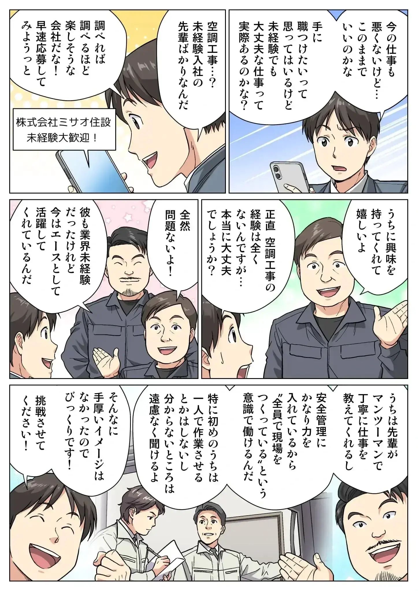 元配送ドライバーやIT業界など、まったく違う業界から転職してきた社員が多いのも特徴です。「空調工事って難しそう…」と不安だった先輩たちも、今ではプロの技術者として現場で頼られる存在に。未経験スタートでも、ゼロから丁寧に学べる環境が整っています。